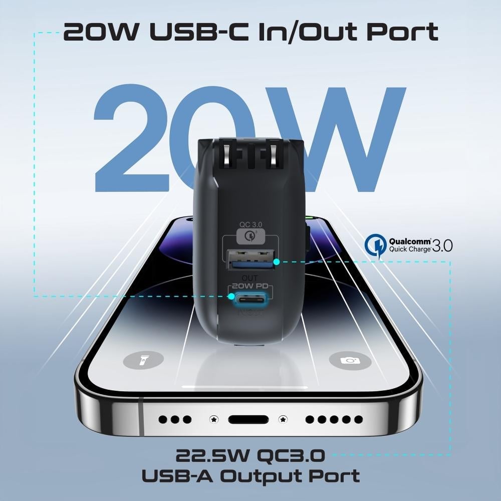 بطارية متنقلة متعددة الوظائف: PowerPack-10C هو جهاز مدمج يجمع بين شاحن حائط وبطارية متنقلة في تصميم صغير وقوي، مما يجعله مثاليًا لتلبية جميع احتياجات الشحن أثناء التنقل.