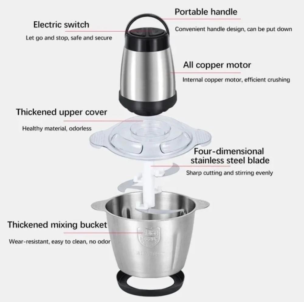 تصميم سهل التنظيف وسهل الاستخدام يمكن تفكيك المفرمة لتنظيف الملحقات بسهولة أكبر. يأتي محضر الطعام مع بساط مقاوم للانزلاق، يمكنك وضع الوعاء على البساط. كل شيء عملي.