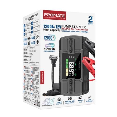أقوى اشتراك تشغيل سيارة بقدرة عالية جدا تصل 1200 أمبير/12 فولت المزود بضاغط هواء للعجلات ومصباح يدوي LED بقوة 270 لومن مع بطارية متنقلة بسعة 12000مللي أمبير ومنفاخ للعجلات يصل إلى 150 PSI بالإضافة إلى مشابك ذكية وشاشة LCD