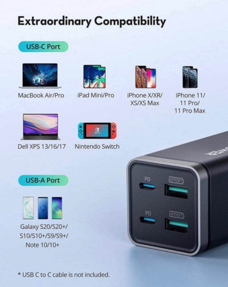 - توزيع ذكي للطاقة: يوزع بذكاء 65 واط من الطاقة عند شحن 4 أجهزة في وقت واحد ، ويضمن حصول جميع أجهزتك المتصلة على شحن عالي السرعة