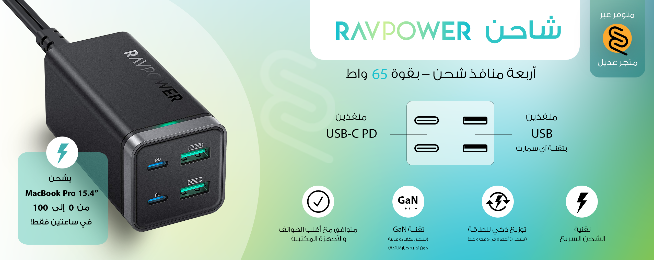 شاحن مكتبي بقدرة 65 واط من شركة Ravpower, يمكنك من توفير خيارات عديدة لشحن أجهزتك بجهاز واحد .