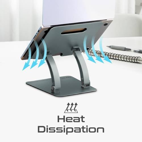 حامل DeskMate-7 يعزز تدفق الهواء حول الكمبيوتر المحمول ويعمل على توزيع الحرارة بعيداً عنه بفضل تصميمه المائل للأمام. هذا يساعد في الحفاظ على برودة جهازك، مما يسمح لك باستخدامه بكفاءة لفترات أطول ويزيد من إنتاجيتك.