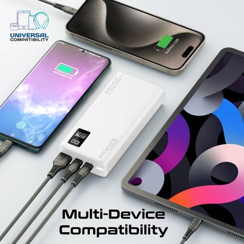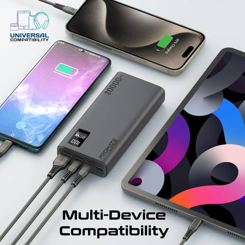 تمكنك بطارية Bolt-20PD من بروميت شحن ما يصل إلى ثلاثة أجهزة بشكل متزامن وبإجمالي إخراج بقوة 20 واط عبر جميع المنافذ، مما يجعلها مثالية للمشاركة مع الأصدقاء أو العائلة أو الزملاء. سواء كنت تشحن هاتفك الذكي أو اللوحي أو سماعات الرأس اللاسلكية، يمكنك ابقاء أجهزتك متصلة ومشحونة أينما كنت.