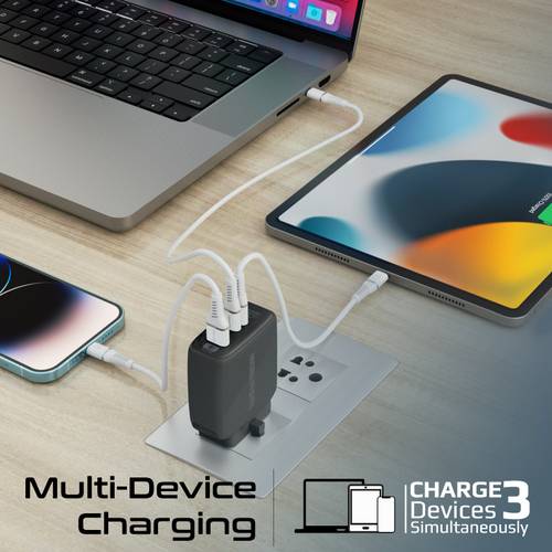 شحن عالي السرعة لثلاثة أجهزة في وقت واحد: يتيح لك هذا الشاحن المصنوع من نتريد الغاليوم شحن ثلاثة أجهزة في آن واحد دون الحاجة لتحديد أي منها أولًا، مما يضمن لك الشحن بأقصى سرعة لجميع أجهزتك.