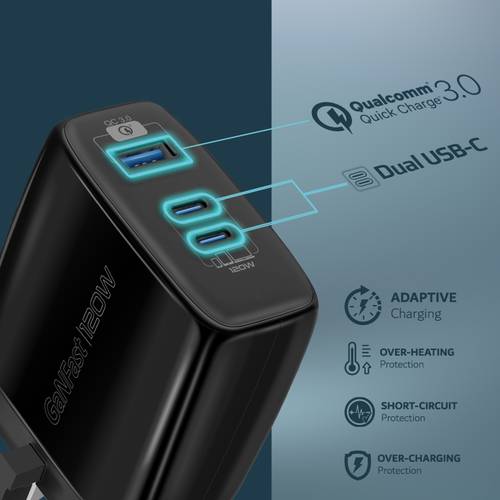 شاحن حائط فائق الصغر بقوة 120 واط، يحتوي على منفذين من النوع C™ ومنفذ QC 3.0 بقوة 18 واط، مما يتيح شحنًا سريعًا وفعالًا، كما يدعم الشحن الذكي المتكيف ويضمن حماية من الدوائر القصيرة لحماية الأجهزة