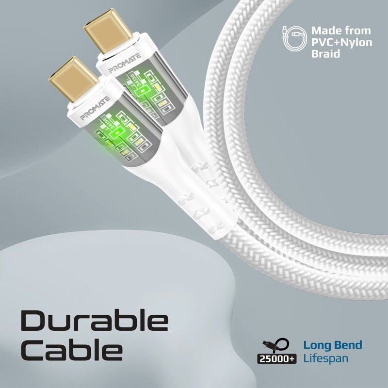 تم اختبار Promate TransLine-CC200 للانحناء لتحمل أكثر من 25000 انحناء. تم تصميم كابل USB-C ™ المجدول من النايلون لتحمل أقصى قدر من الضغط والإجهاد. لا داعي للقلق بشأن الكابلات التالفة التي لا يتم شحنها بشكل صحيح.