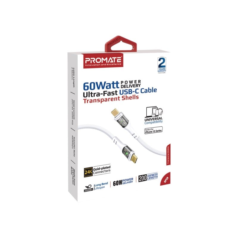 يأتي كابل Promate TransLine-CC200 بموصلات مطلية بالذهب ومقاومة للتآكل، والتي توفر خرج طاقة مثالي. كما يوفر الموصل المطللي بالذهب لأجهزتك تجربة شحن مستقرة وسريعة للغاية.