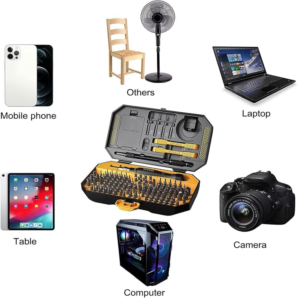 • 145 قطعة متنوعة تشمل مفكات دقيقة، رؤوس متعددة الأشكال، أدوات فتح احترافية، وأكثر.