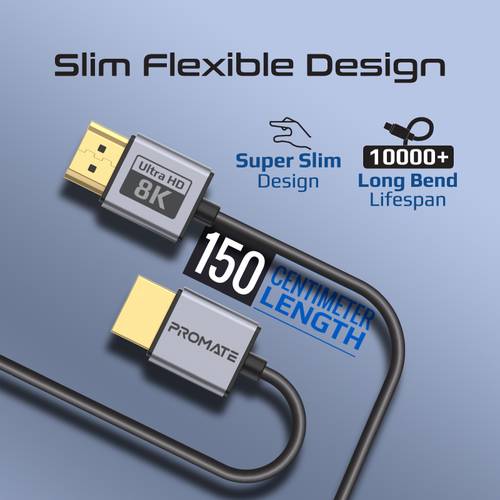 يتصل كابل Promate PrimeLink8K-150 HDMI 2.1 بمجموعة متنوعة من شاشات العرض بما في ذلك أجهزة UHDTV والشاشات. يمنحك هذا أفضل طريقة ممكنة لتجربة كل المحتوى الخاص بك من أجهزتك المفضلة.