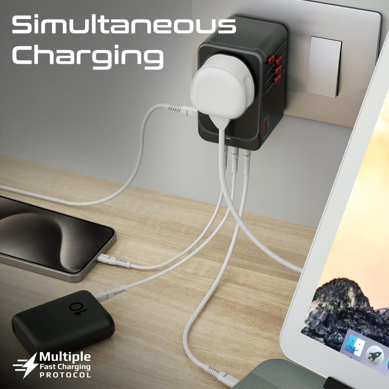 يأتي TripMate-GaN100 مزودًا بأربعة منافذ USB-C™ بقدرة 100 واط ومنفذ QC 3.0 USB-A، مما يتيح شحن ما يصل إلى أربعة أجهزة في نفس الوقت، بما في ذلك الهواتف الذكية والأجهزة اللوحية والكمبيوترات المحمولة وبنوك الطاقة. يتمتع هذا المحول الشامل بمقابس متوافقة مع أكثر من 180 دولة.