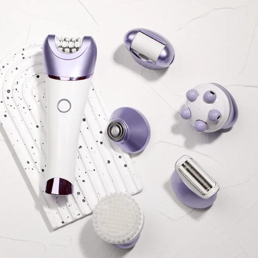 جهاز إزالة الشعر 6 في 1 هو الحل المتكامل للعناية بجسمك. يجمع بين إزالة الشعر، الحلاقة، التقشير، التدليك، والعناية بالقدمين، ليمنحك نعومة تدوم وراحة تشبه نتائج الصالونات وكل هذا من منزلك.