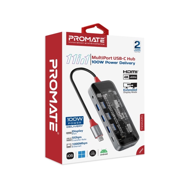 وصلة تبادل البيانات بكفاءة عالية مع موزع TransHub-Pro متعدد المنافذ 11 في 1 شفاف فائق السرعة مع توصيل طاقة بقدرة 100واط ومنفذ HDMI بدقة 4K وشبكة LAN بسرعة 1000 ميجابت في الثانية مع منافذ USB 3.0 ،USB 2.0 وAUX بالإضافة إلى فتحات بطاقة SD/TF