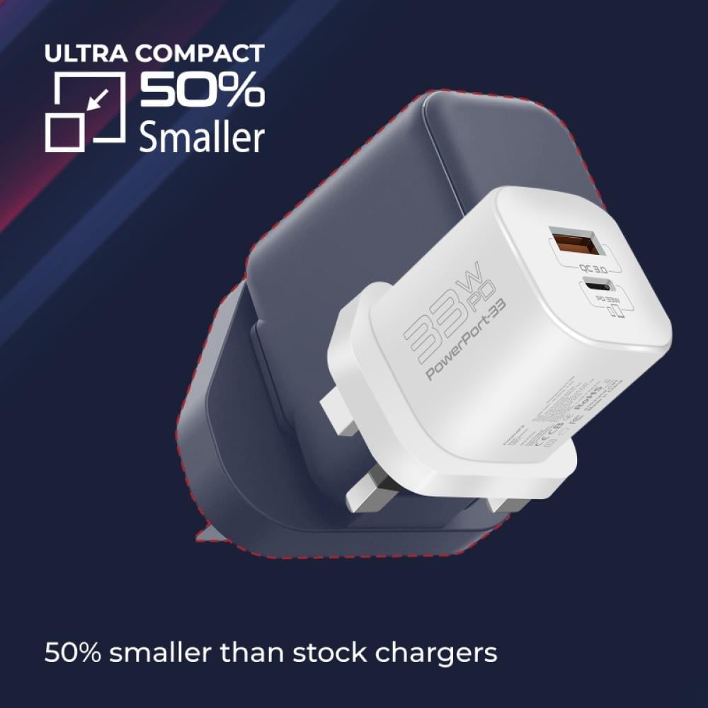 يتميز شاحن PowerPort-33 بالجيل التالي من تقنية GaNFast (نيتريد الغاليوم) ومجموعة شرائح GaN لتقليل الحجم ونقل الطاقة العالية. توفر مكونات نيتريد الغاليوم شحنًا أسرع من أجهزة الشحن القياسية القائمة على مكونات السيليكون.