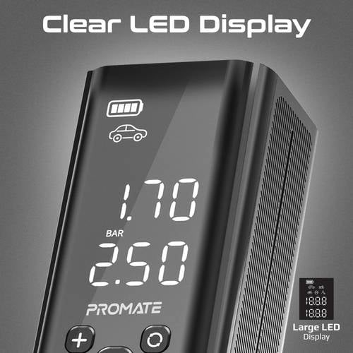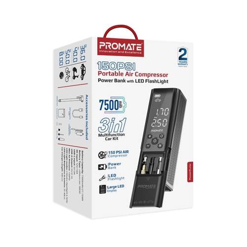 اكتشف تنوعًا وموثوقية لا مثيل لها مع PowerPump من Promate، وهو ضاغط هواء محمول ومتعدد الوظائف بقوة 150 رطل/بوصة مربعة. يجمع هذا الجهاز المبتكر بين الميزات الأساسية مثل نظام مراقبة ضغط الإطارات المدمج ومصباح يدوي LED قوي مع وظيفة SOS وبطارية متنقلة بسعة 7500 مللي أمبير في الساعة مع مخرج USB-A، وهو الرفيق المثالي لحالات الطوارئ في السيارات والراحة اليومية. بفضل شاشة LED المدمجة الواضحة التي تتيح لك متابعة الضغط في الوقت الفعلي. مصمم للنفخ السريع، يوفر PowerPump الأمان والكفاءة وراحة البال أثناء رحلاتك.