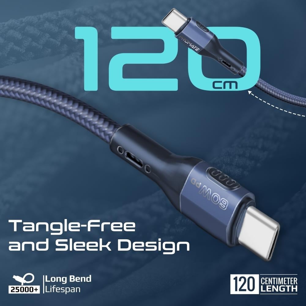 كيبل USB-C إلى USB-C الموثوق والقوي، الذي يقدم شحنًا سريعًا بقوة 60 واط وسرعات نقل بيانات تصل إلى 480 ميجابت في الثانية، بطول 120 سم. مصمم من مواد متينة لتحمل التآكل اليومي، ليكون رفيقك المثالي في عالم التكنولوجيا.