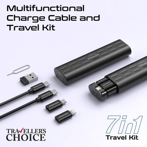 مجموعة السفر المتكاملة 7 في 1 التي تحتوي على كيبل شحن USB-C بقدرة 60 واط ومحول USB-C إلى لايتنينغ و USB-A و Micro-USB كما تتضمن فتحات لبطاقات SIM Micro وNano، وبطاقة TF بالإضافة إلى دبوس لإخراج بطاقة SIM بتصميم صغير
