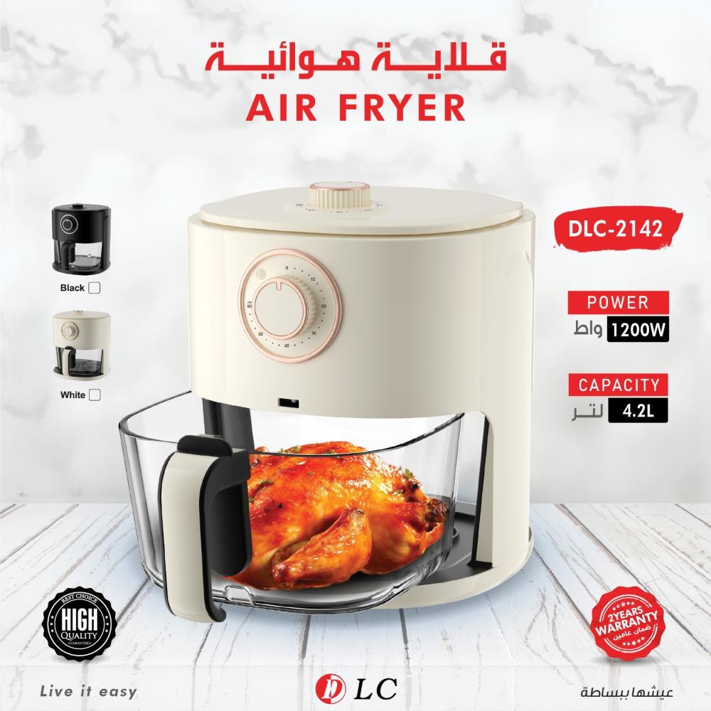 قلاية هوائية بتصميم عصري وأنيق، متوفرة باللونين الأسود والأبيض، مما يمنحها لمسة جمالية تتناسب مع ديكورات المطابخ المختلفة. تتميز هذه القلاية بسعة كبيرة ونافذة شفافة تسمح بمراقبة عملية الطهي دون الحاجة لفتح الدرج، مما يجعلها خياراً مثالياً لتحضير وجبات صحية ولذيذة بكميات وفيرة.