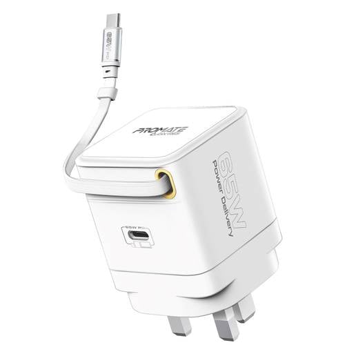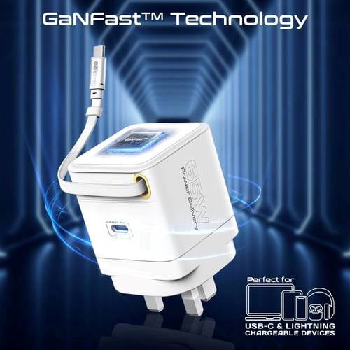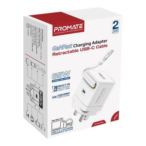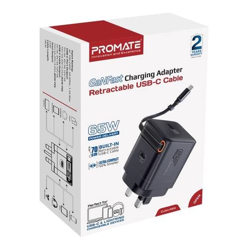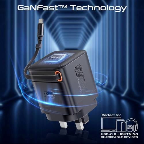 شاحن GaN فائق السرعة بقوة 65 واط مع كابل USB-C قابل للسحب، منفذ توصيل طاقة USB-C، تقنية GaNFast، نظام حماية متعدد، تصميم مدمج مثالي للسفر، شحن سريع وآمن للابتوب، الهواتف الذكية، التابلت والأجهزة المتوافقة الأخرى!