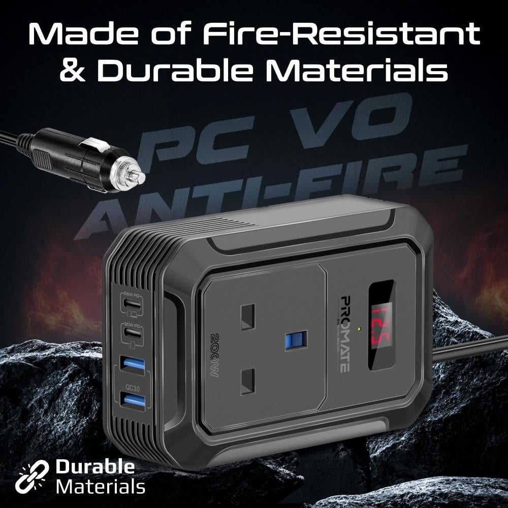 محول Inverto-200W من Promate، الرفيق المثالي للسيارة لمن يحتاجون إلى طاقة موثوقة أثناء التنقل. يوفر المحول مقبس تيار متردد بقوة 200 واط، مع منفذين USB-C يدعمان توصيل الطاقة، بالإضافة إلى منفذين QC USB-A، مما يتيح لك شحن أجهزة متعددة في وقت واحد. تتيح لك شاشة LCD الرقمية متابعة جهد البطارية في الوقت الفعلي. بالإضافة إلى ذلك، يضمن نظام الحماية المتقدم حماية أجهزتك من الدوائر القصيرة، تقلبات الجهد، والسخونة الزائدة. مع تصميم متين ومقاوم للحريق، يعد محول Inverto-200W خيارًا آمنًا وفعالًا للطاقة، أينما كنت.