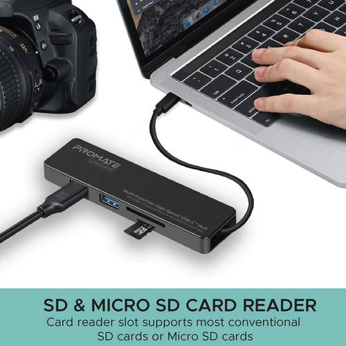 بالإضافة إلى ذلك، يتميز موزع Promate LinkHub-C بفتحات قارئ بطاقات SD وmicroSD لنقل البيانات من أجهزة مثل وحدات التحكم في الألعاب أو الكاميرات إلى جهاز MacBook أو الكمبيوتر المحمول الخاص بك.