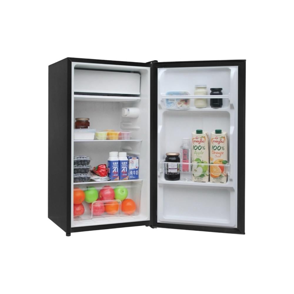 ثلاجة صغيرة الحجم تتميز بتصميم مدمج وأنيق بلون أسود ، صغيرة ومناسبة للاستخدام في الأماكن ذات المساحة المحدودة ، تحتوي على رفوف داخلية قابلة للتعديل ، درج سفلي لتخزين الفواكه والخضروات ، أماكن تخزين على باب الثلاجة لوضع المشروبات والعبوات ،فصل علوي (فريزر) صغير لتبريد وتجميد بعض الأطعمة.