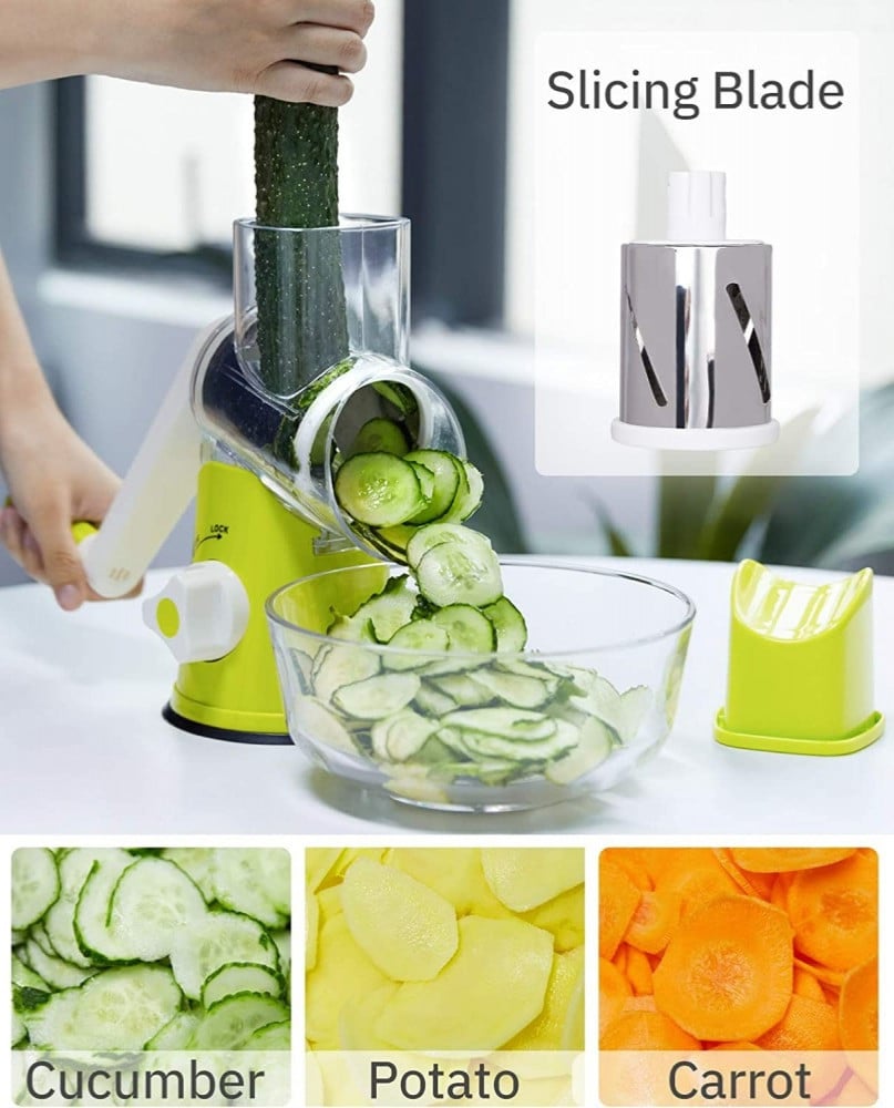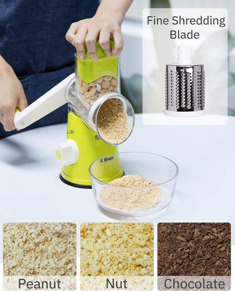 قطاعة خضار يدوية ومطحنة مكسرات توفر عليك مجهود التقطيع التقليدي ، مزودة بمبشرة يدوية دوارة مع 3 شفرات مدورة ، سهلة الاستخدام تناسب جميع الاصناف الغذائية