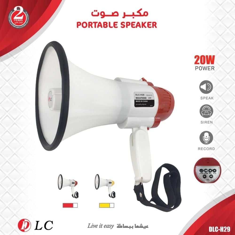 مكبر صوت محمول يدوي (بوق)، وهو من طراز "PORTABLE SPEAKER" من ماركة "DLC". يتميز بتصميم كلاسيكي باللونين الأبيض والأحمر، مع مقبض قابل للطي وحزام لسهولة الحمل والاستخدام. يحتوي على لوحة تحكم في الخلف مع أزرار للوظائف المختلفة، وميكروفون مدمج.