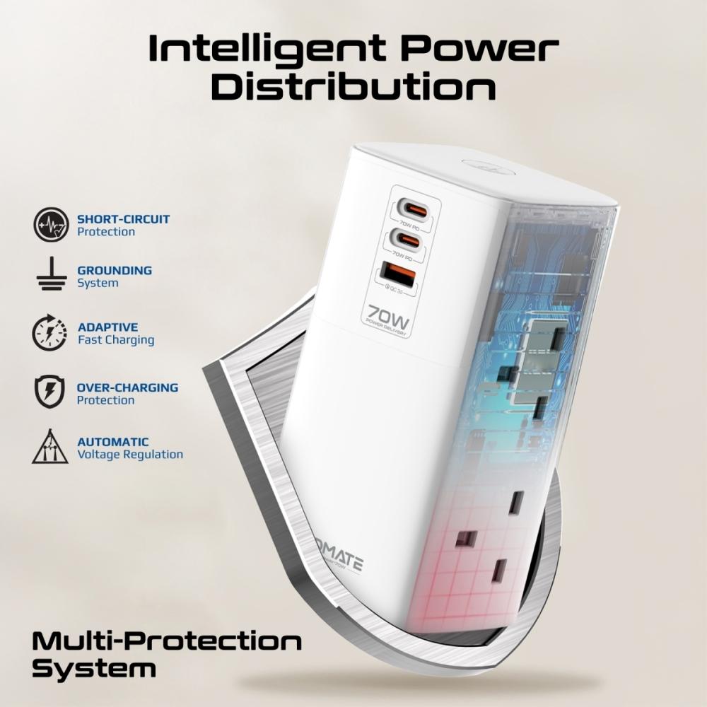 تم تصنيع PowerTower-70W من مواد مقاومة للاشتعال، ويتميز بخصائص الشحن السريع التكيفية، وتنظيم تلقائي للجهد، وحماية شاملة من الشحن الزائد والسخونة الزائدة، مما يضمن السلامة عند الاستخدام. كما أن طول الكابل البالغ 3 أمتار يوفر سهولة الوصول ويحوّل مكتبك أو منزلك إلى مركز ابتكار وكفاءة.