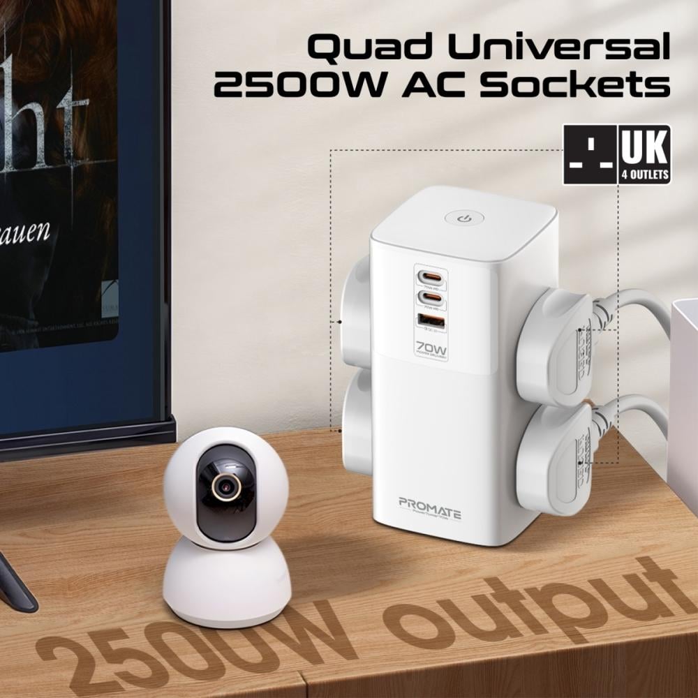 PowerTower-70W من Promate هو الحل المتكامل والموفر للمساحة لشحن جميع أجهزتك بكفاءة وسلاسة. يجمع هذا الجهاز القوي بين التصميم الأنيق والمرونة العالية، حيث يحتوي على منفذي USB-C توصيل طاقة بقدرة 70W، ومنفذ QC 3.0 بقوة 30W، بالإضافة إلى أربعة منافذ AC عالمية بقدرة 2500W لتلبية احتياجات جميع أجهزتك.