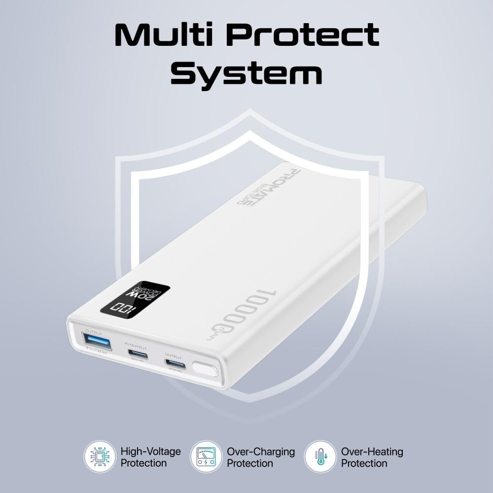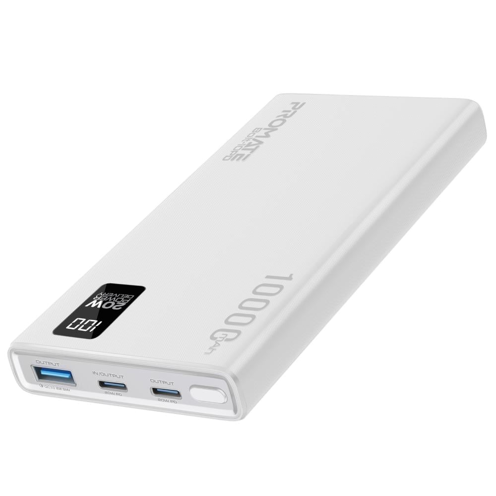 يمّكنك باوربانك Bolt-10PD من بروميت شحن ما يصل إلى ثلاثة أجهزة سوية بشكل متزامن وبإجمالي إخراج بقوة 20 واط عبر جميع المنافذ، مما يجعله مثاليًا للمشاركة مع الأصدقاء أو العائلة أو الزملاء. سواء كنت تشحن هاتفك الذكي أو اللوحي أو سماعات الرأس اللاسلكية، يمكنك بقاء أجهزتك متصلة ومشحونة أينما كنت.