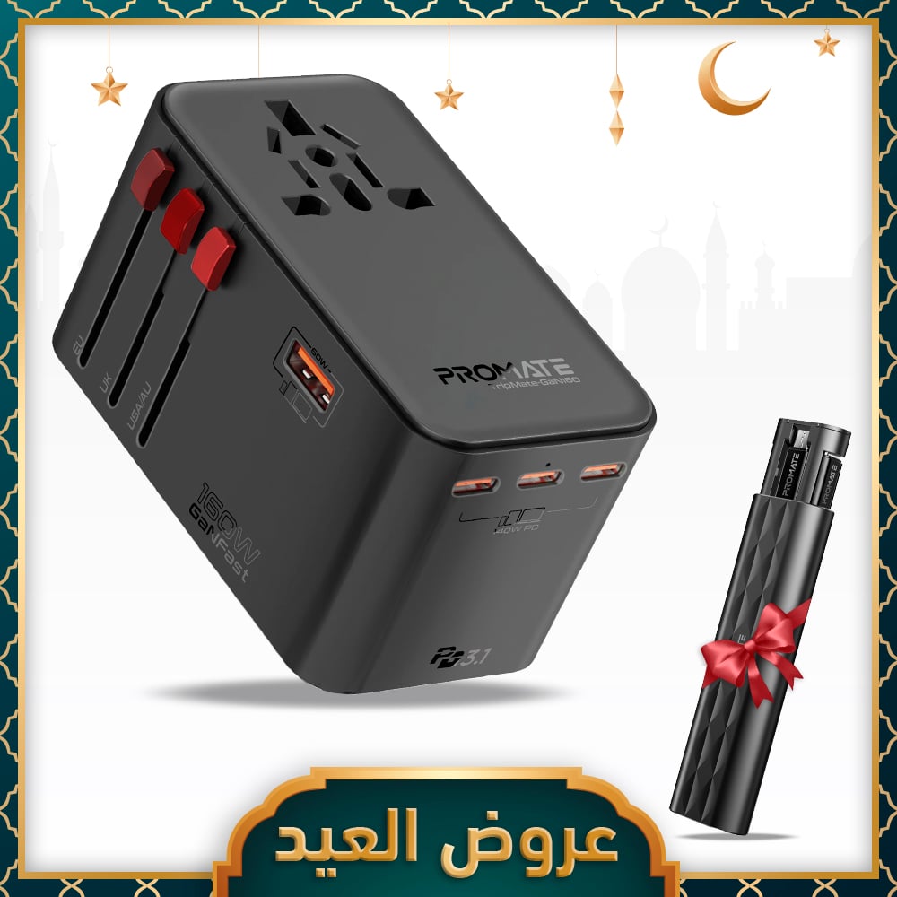 TripMate-GaN160 من Promate – شاحن سفر عالمي بقوة 160 واط مع تقنية GaNFast™ ومنافذ متعددة لشحن سريع وآمن ⚡🌍