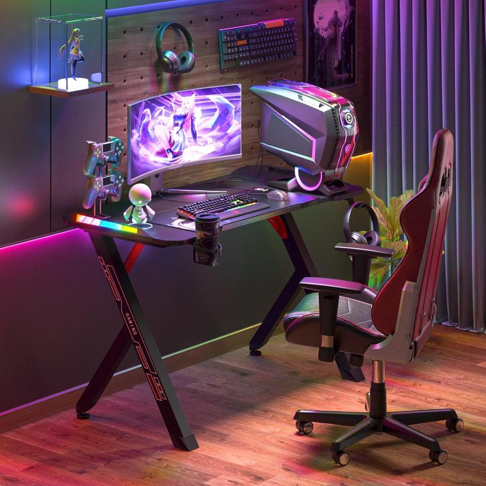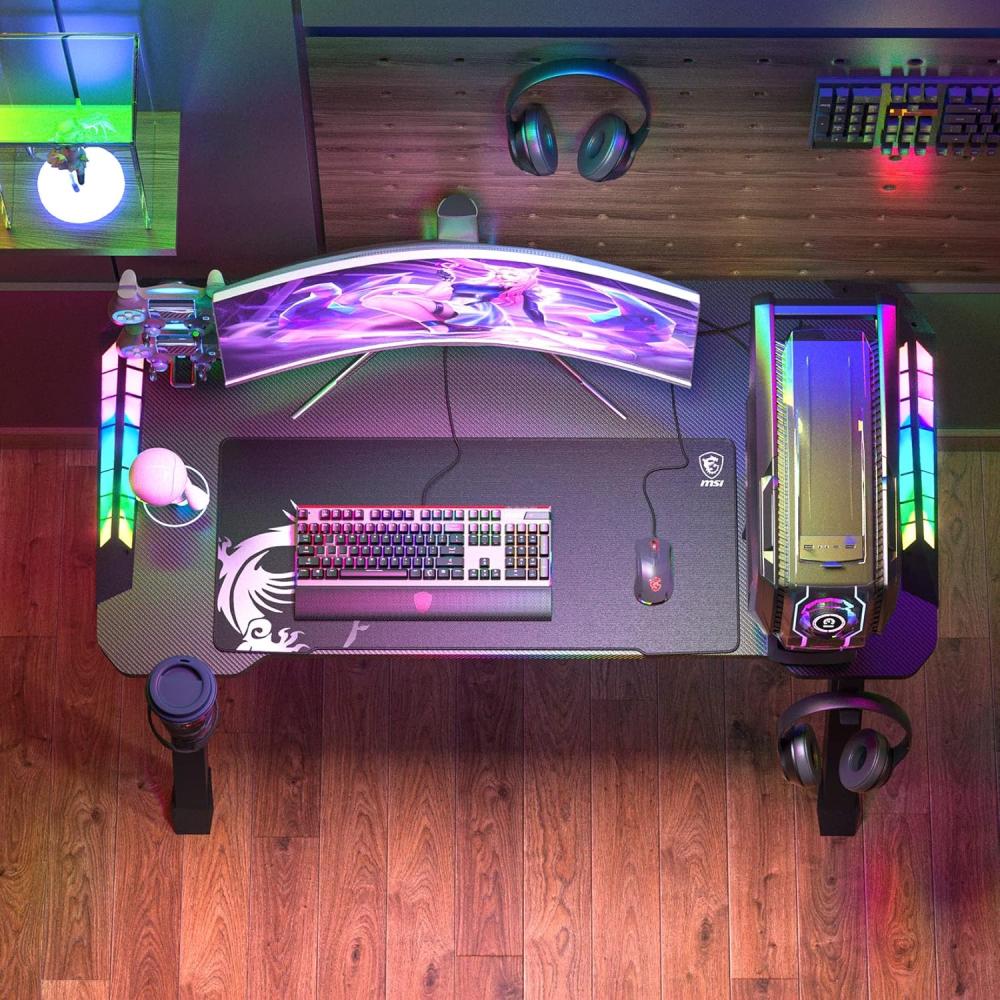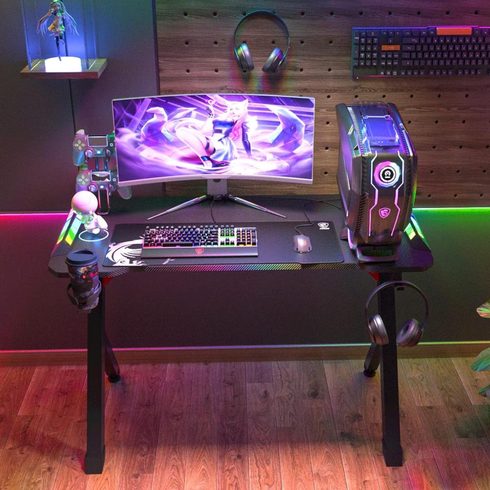 - سطح واسع: توفر الطاولة مساحة عمل واسعة تكفي لوضع شاشتك ولوحة المفاتيح والماوس وأجهزة الألعاب الأخرى.