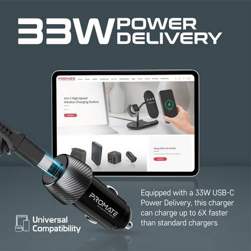 مزود بشاحن سيارة بقوة 33 واط يناسب أجهزة لايتنينغ وUSB-C™، يمكنه الشحن بسرعة تصل إلى 6 أضعاف الشواحن التقليدية.