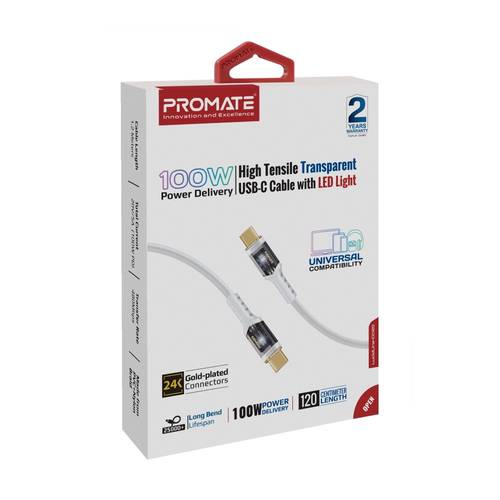 كابل USB-C فائق السرعة لتوصيل الطاقة بقوة 100واط، مزود برؤوس شفافة لتجربة شحن لا مثيل لها. يدعم نقل البيانات والشحن السريع مع ضوء LED لمؤشر الشحن، بطول 2 متر وعمر انحناء يزيد عن 25000 مرة مع رأس شحن مطلي بالذهب