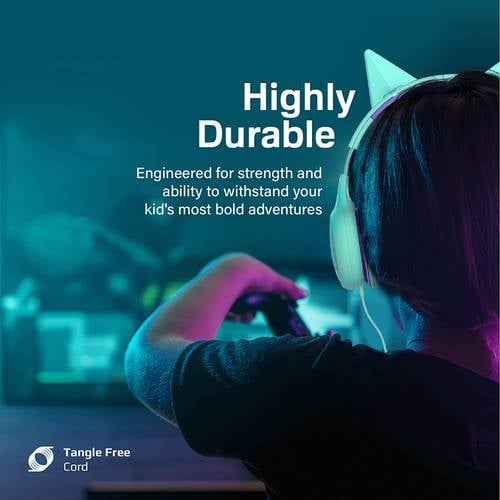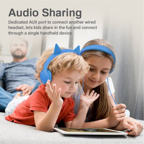 سماعة رأس سلكية للأطفال بتقنية SafeAudio™ عالية الدقة، تتميز بمنفذ مشاركة الصوت وصوت آمن يبلغ 85 ديسيبل. تحتوي على وسادات أذن مبطنة للراحة وتصميم قابل للطي لسهولة الحمل. تأتي مع آذان قطة لطيفة يمكن فصلها