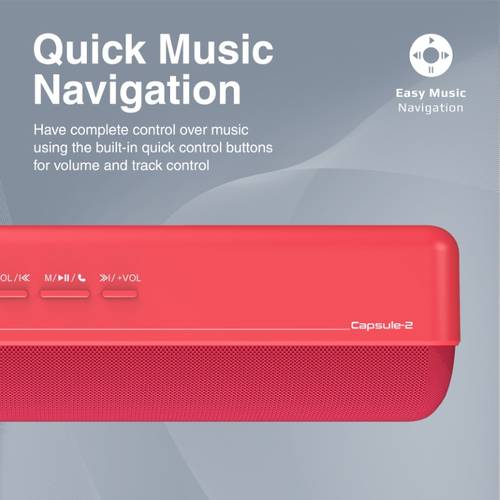 استمتع بصوت نقي وجميل مع Capsule-2، الذي يوفر صوتًا قويًا بقدرة 6 واط بفضل مكبرات الصوت المصممة خصيصًا لإنتاج ترددات عالية واضحة. يمكنك تشغيل موسيقاك المفضلة عبر خيارات اتصال متعددة. كما أن تصميمه الصغير والخفيف يجعل من السهل حمله ونقله أينما ذهبت.