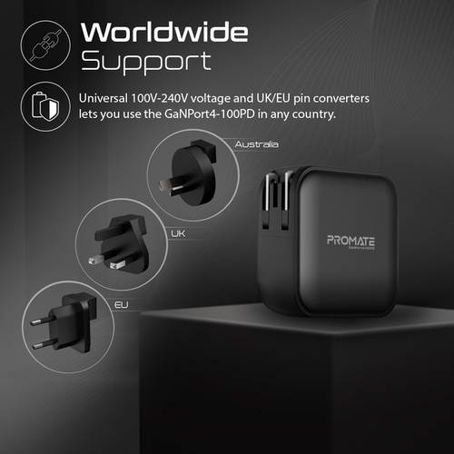 مقابس متعددة المناطق للمسافرين حول العالم: يأتي شاحن Promate GaNPort4-100PD مع جهد كهربائي عالمي يتراوح بين 100 فولت و 240 فولت. يتميز هذا الشاحن بثلاث منافذ USB ومحولات قابلة للتبديل للتوافق مع الولايات المتحدة، والمملكة المتحدة، والاتحاد الأوروبي. بفضل تلك الأداة متعددة الاستخدامات، يمكنك استخدامها في معظم البلدان.