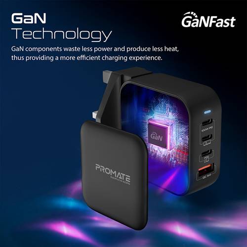تقنية GaN للشحن الفعال والقوي: تقنية GaN للشحن الفعّال والقوي تُظهرها شاحن GaNPort4-100PD بجيله التالي من GaNFast (نيتريد الغاليوم) ومجموعة شرائح GaN التي تُقلل الحجم وتنقل الطاقة بكفاءة عالية. يمكن لـ GaNPort4-100PD شحن ما يصل إلى 4 أجهزة، من سماعات الأذن وصولاً إلى الهواتف الذكية والأجهزة اللوحية وحتى MacBook Pro. تُقلل مكونات GaN من إهدار الطاقة وإنتاج الحرارة مما يوفر تجربة شحن أكثر كفاءة وموثوقية.