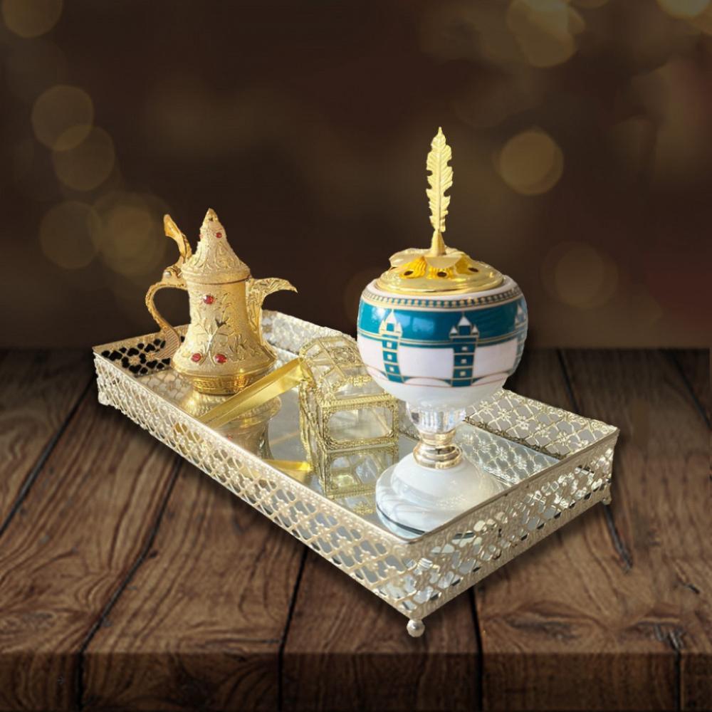 صينيه بقاعده مرآه تعكس روعه ما تحمله من مبخره نحاسيه بالوان عصريه وابريق الشاي العربي الذهبي مع ماسك معدني ذهبي .